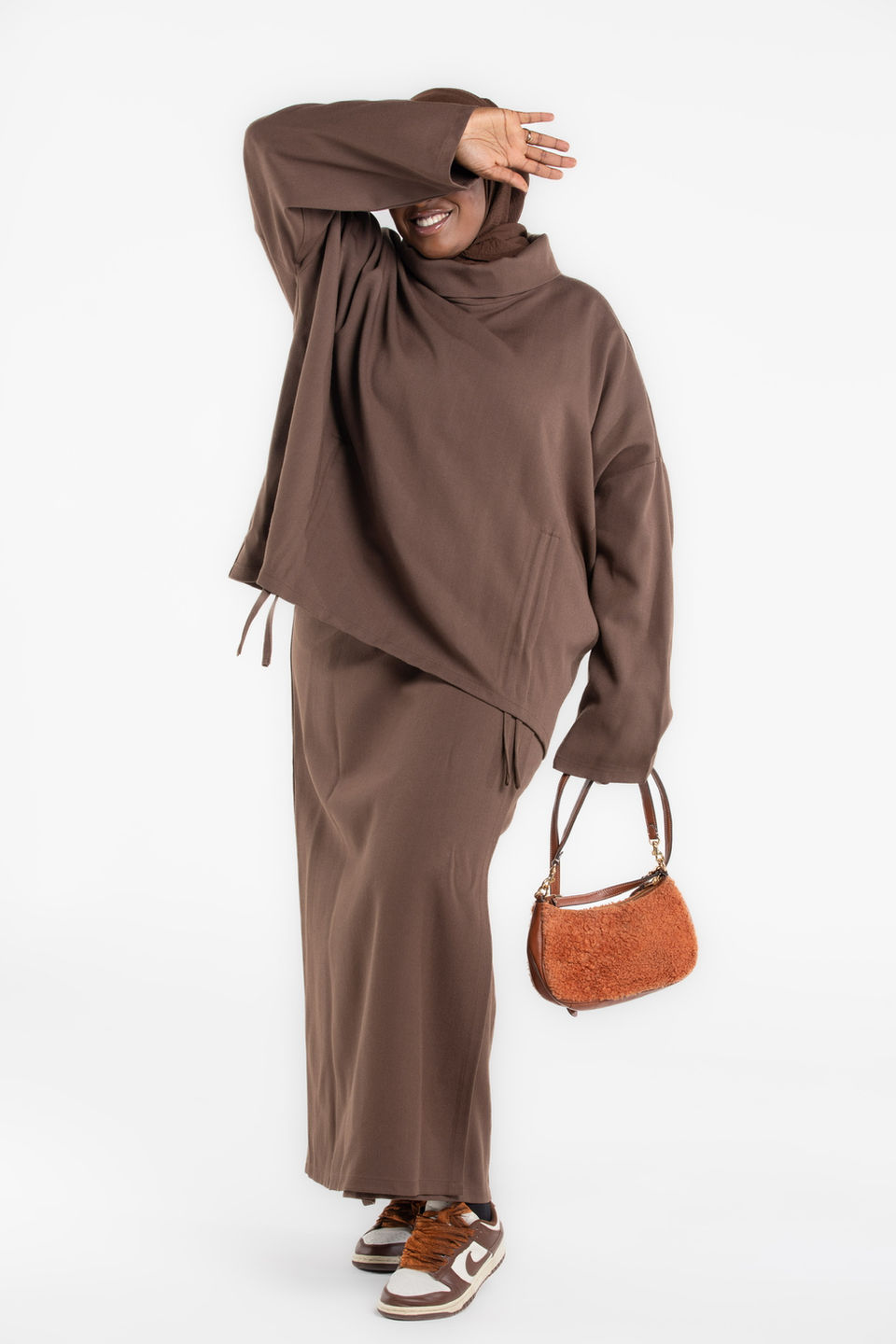 Combinez le pull et la jupe pour un look coordonné et élégant, parfait pour les journées fraîches.