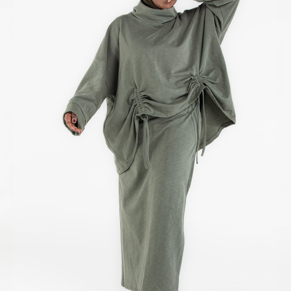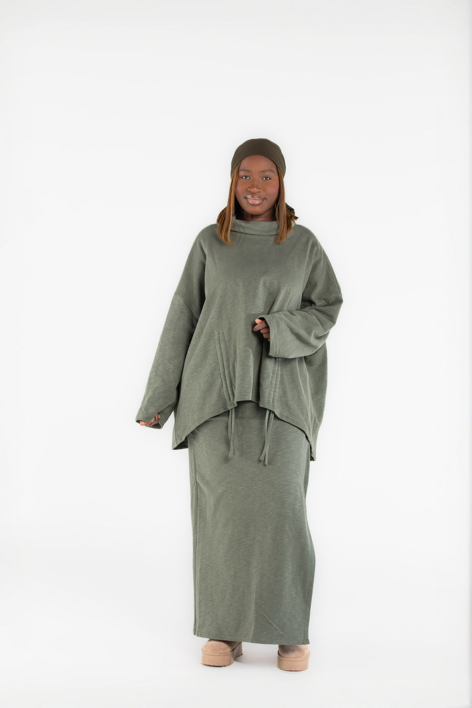 Pull à col haut montant souple et retroussable à manches larges. Lacets ajustables à l'avant pour un style personnalisé et unique.